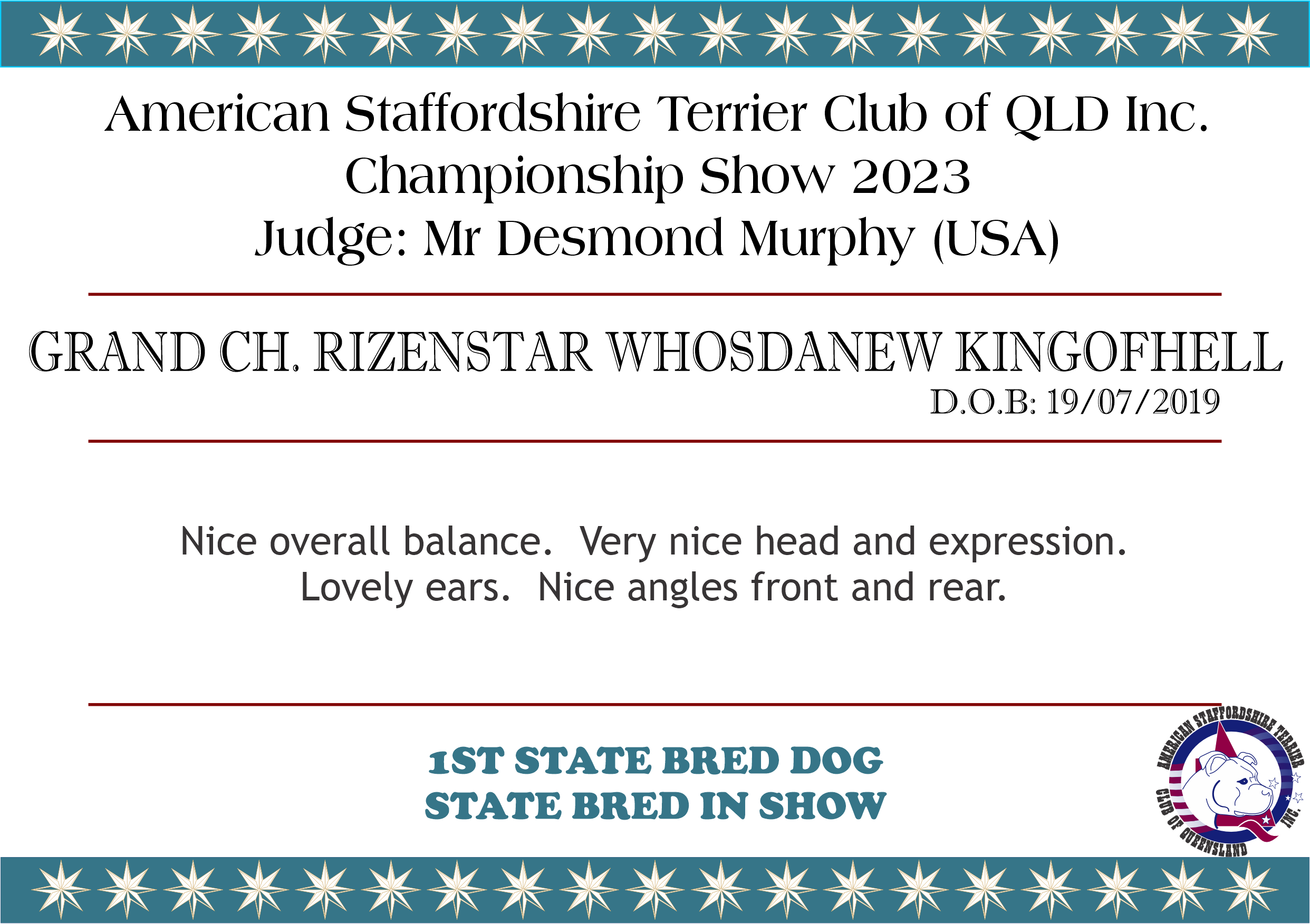 Grand Ch. A2O Ch. Rizenstar Whosdanew Kingofhell JC. SPRD.