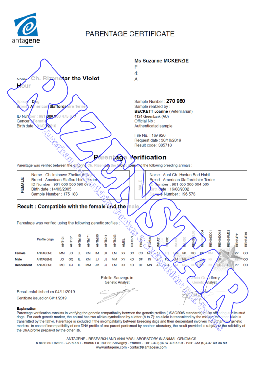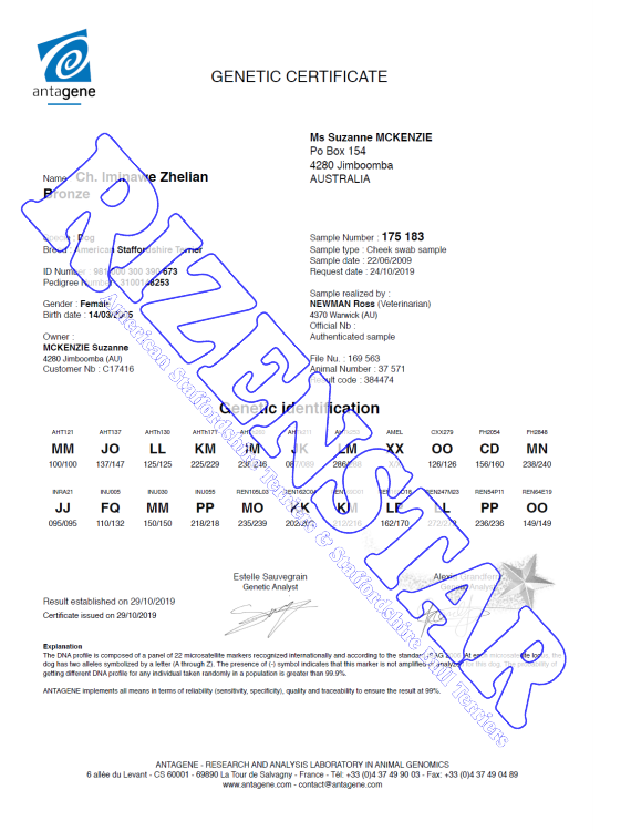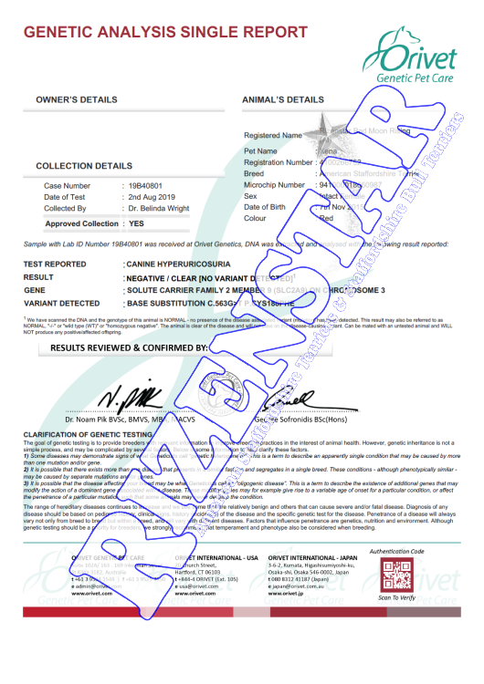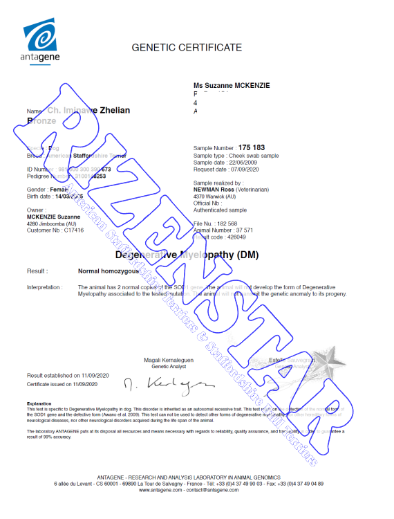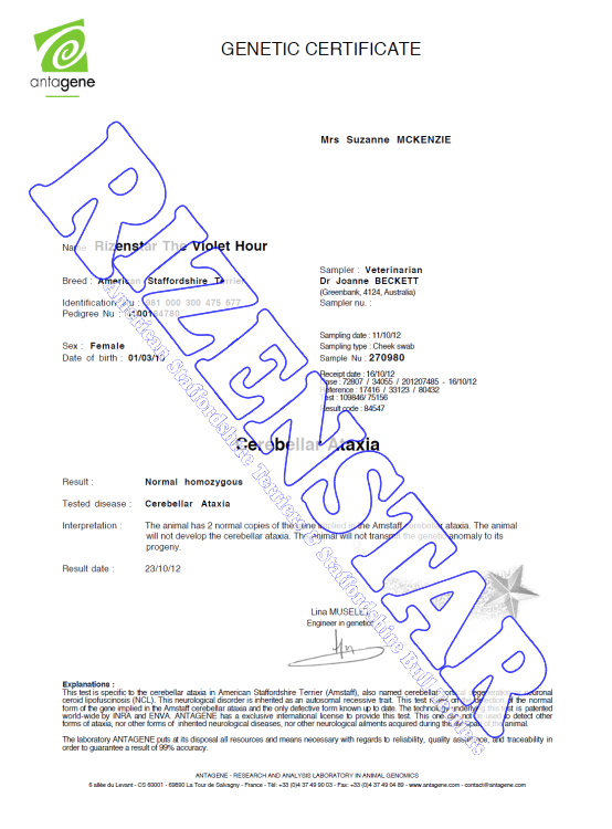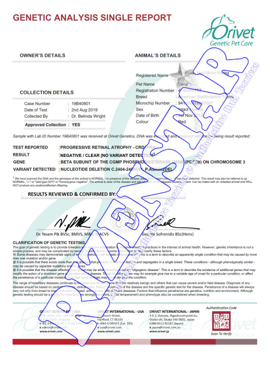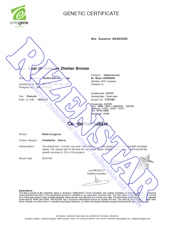 Aust Ch. Staffwild Its Electric DNA-P | DNA-PA | NCL-A Clear by Parentage | HUU Clear | PRA(1) Clear | PRA(2) Clear |
