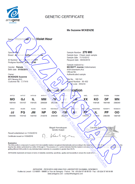 Aust Ch. Rizenstar The Violet Hour DNA-P | DNA-PA | NCL-A Clear | HUU Clear by Parentage | DM Clear by Parentage |