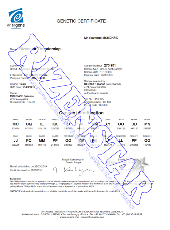Rizenstar Thunderclap DNA-P | DNA-PA | NCL-A Clear | HUU Clear by Parentage | DM Clear by Parentage |