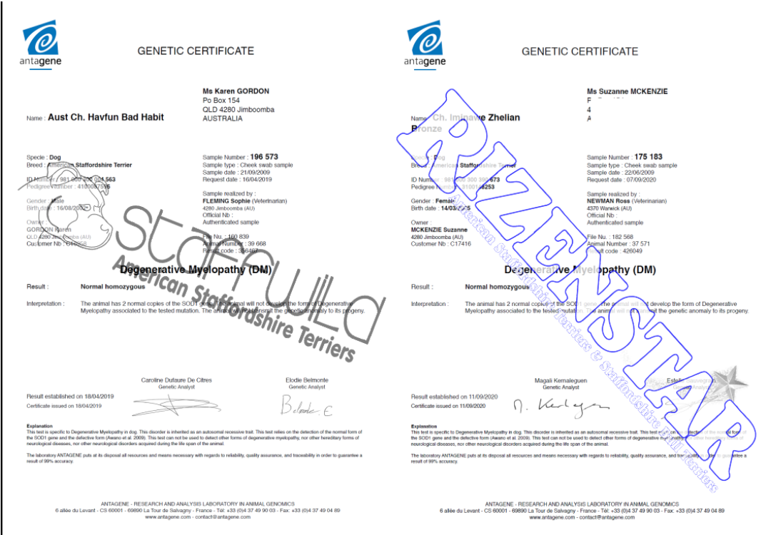 | Legend: DNA-P=DNA Profiled | DNA-PA=DNA Parentage | NCL-A {status}=Cerebellar Ataxia Status | HUU {status}= Hyperuricosuria Status | DM {status} = Degenerative Myelopathy Status | PRA(1) {status} = CRD1PRA Status | PRA(2) {status} = CRD2PRA | ||||