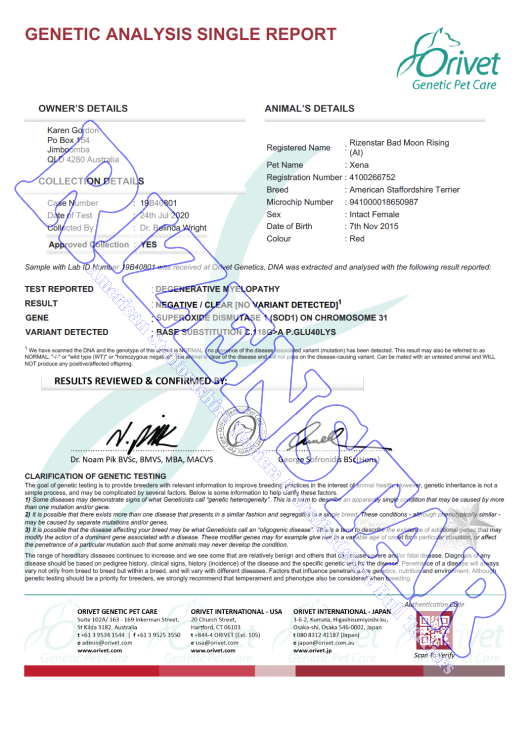 * Clear by Parentage - Parents are tested and dog has been DNA Parentage tested to 100% prove the results.