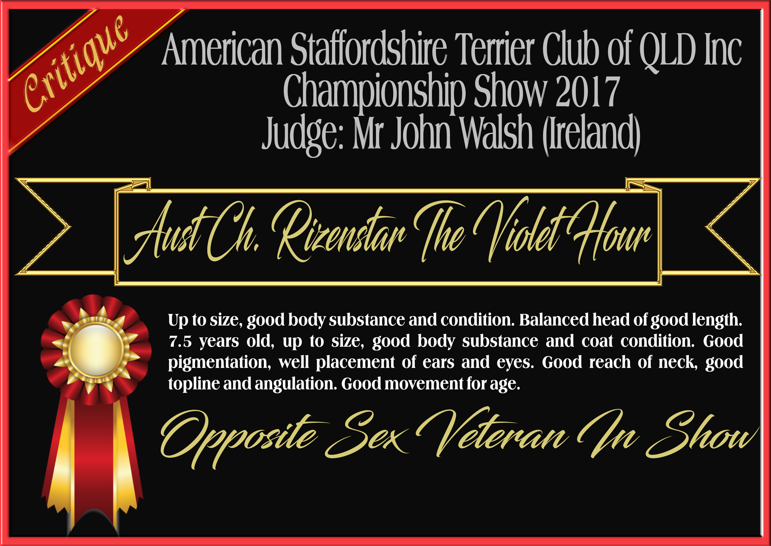 | 7.5yrs old Up to size, good body substance and condition. Balanced head of good length. Good pigmentation, well placement of ears and eyes. Good reach of neck, good topline and angulation. Good movement for age. |