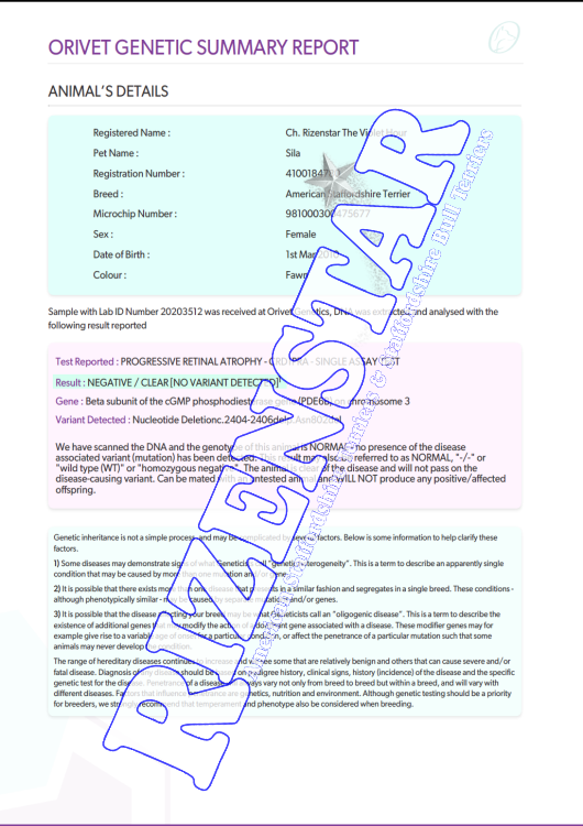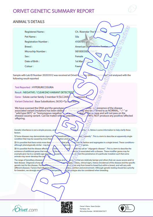 | Legend: DNA=DNA Profiled | DNA-P=DNA Parentage | NCL-A {status}=Cerebellar Ataxia Status | HUU {status}= Hyperuricosuria Status | DM {status} = Degenerative Myelopathy Status | PRA(1) {status} = CRD1PRA Status | PRA(2) {status} = CRD2PRA Status | ||||