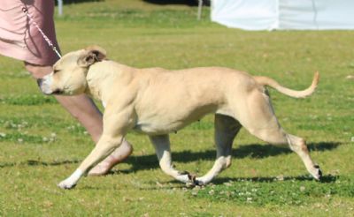 | 7yr 4 month old bitch. Fawn Bitch. Foreface was a little short for me but her height to length was balanced. Good bone and feet, she was just showing her age and on the move a little tiresome. Hindquarters could have been more angulated. |
